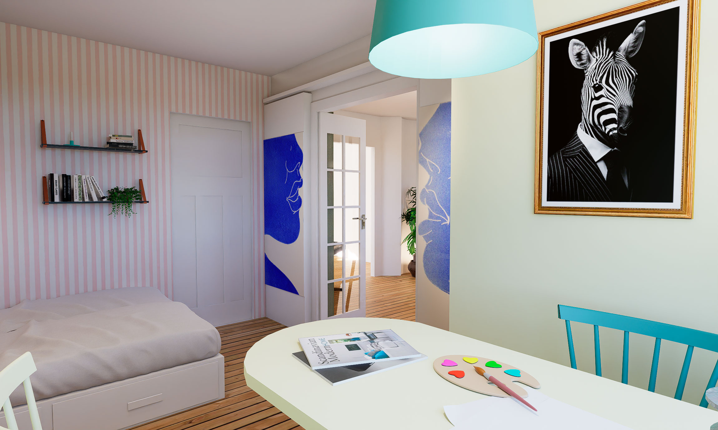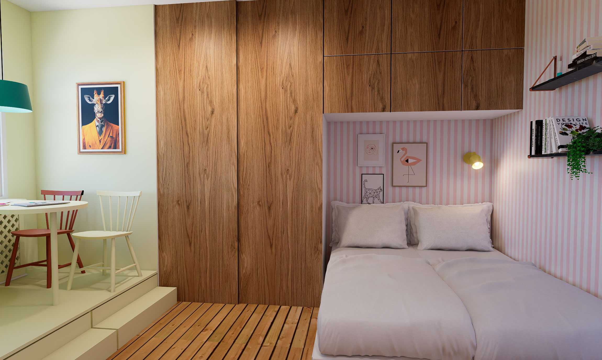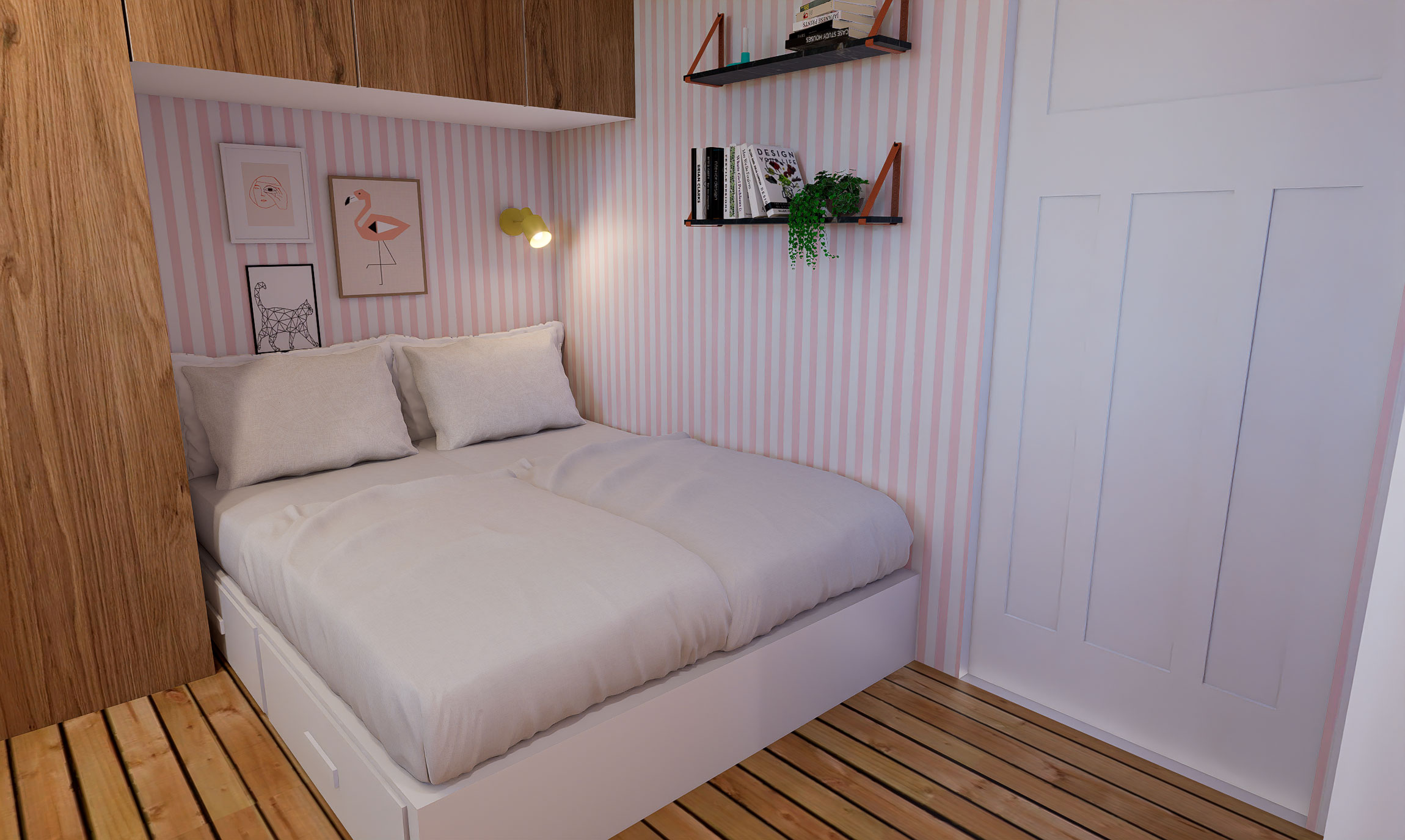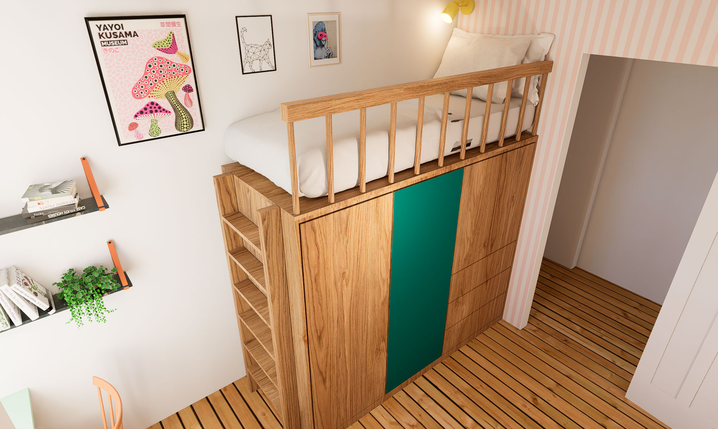 For at løse rumfordelingen arbejdede vi med fleksible sove-løsninger, rumfordeling og opbevaring.