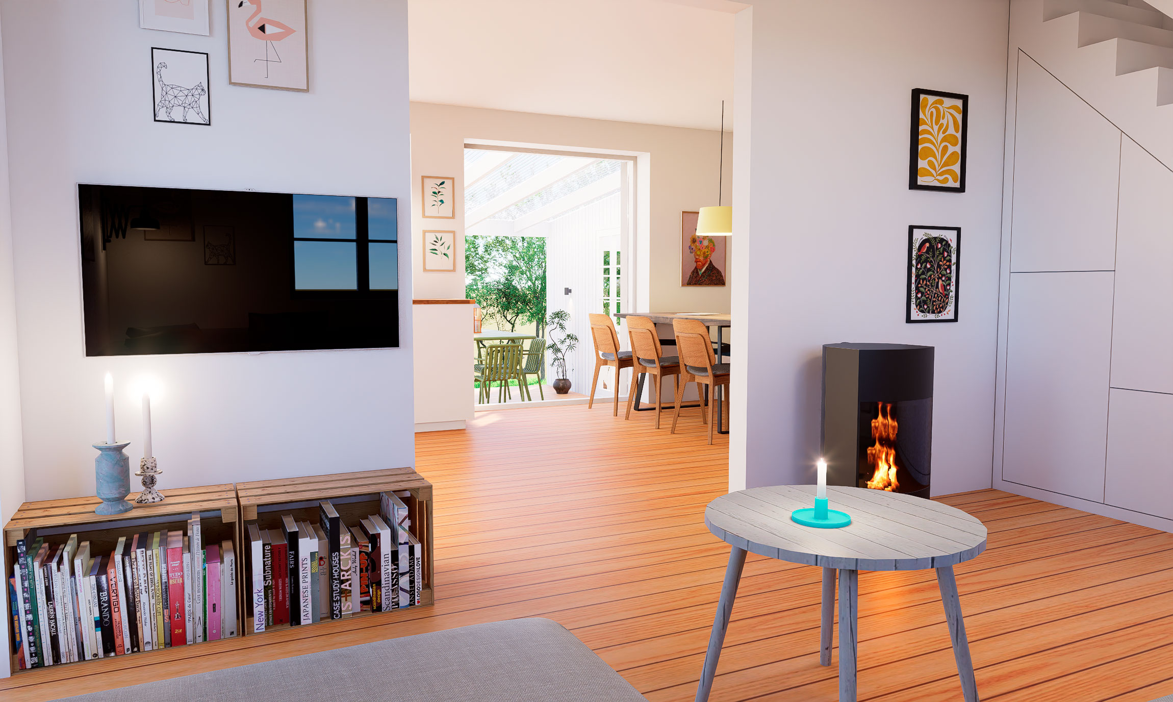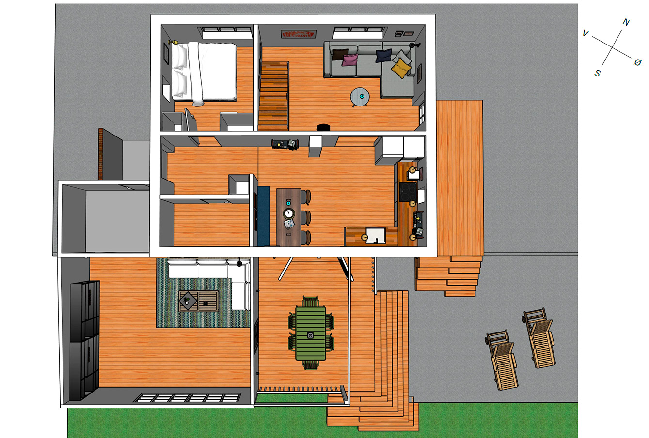 Ved at ændre trappens placering kunne hele kabalen gå op i det lille hus, hvor specielt udsynet og ophold ved haven havde stor prioritet. Trappen blev ligeledes fyldt med opbevaringsplads, der blev prioriteret flere vinduer og døre mod haven og en lille kontorplads på 1. sal.